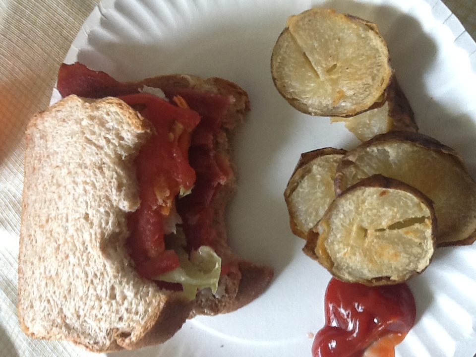 Bake your turkey bacon in the oven on *350 for 20 minutes. Then slice your tomato, add your salad (no really, we used bagged salad, instead of lettuce, time saver and you are welcome). Then bake your potatoes (they had already been baked once) now I cut them and baked them again so they were like potato wheels. Bake them at *350 for 30 minutes and turn them halfway during the cooking.